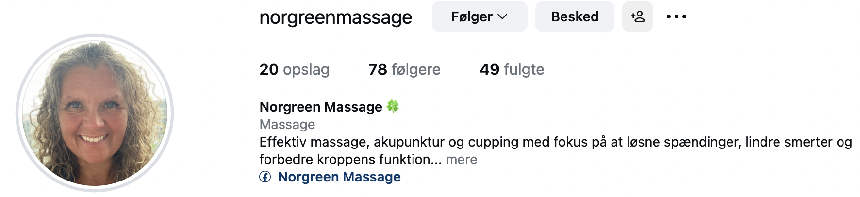Jeg har gået til massage hos Tina i flere år, og det er altid en grundig og professionel behandling. Tina er utrolig dygtig og kombinerer massage og akupunktur på en måde, der virkelig gør en forskel. Hun har hjulpet mig meget med overbelastningsskader fra både træning og arbejde. Jeg kan varmt anbefale Tina - uanset om du har brug for hjælp til et konkret problem eller bare ønsker wellness og velvære.